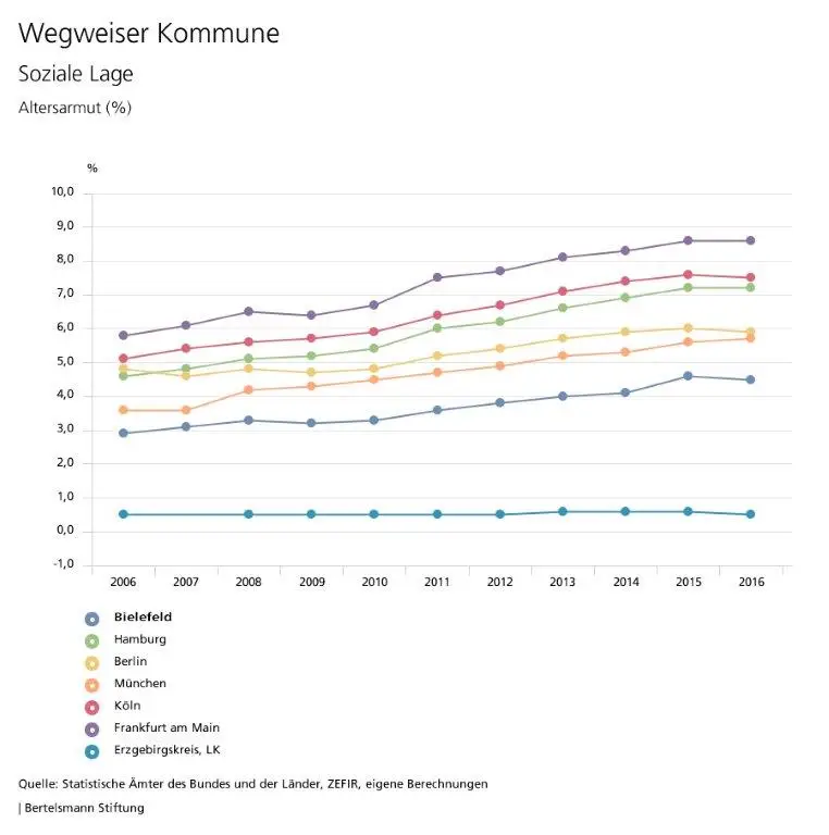 Ein Blick in unseren Wegweiser zeigt, dass es große Unterschiede zwischen den Kommunen gibt. Berlin, Hamburg, Köln, München oder Frankfurt sind Beispiele, denn dort steigen die Anteile von Menschen, die Leistungen zur Grundsicherung im Alter nach SGB XII beziehen, überdurchschnittlich.