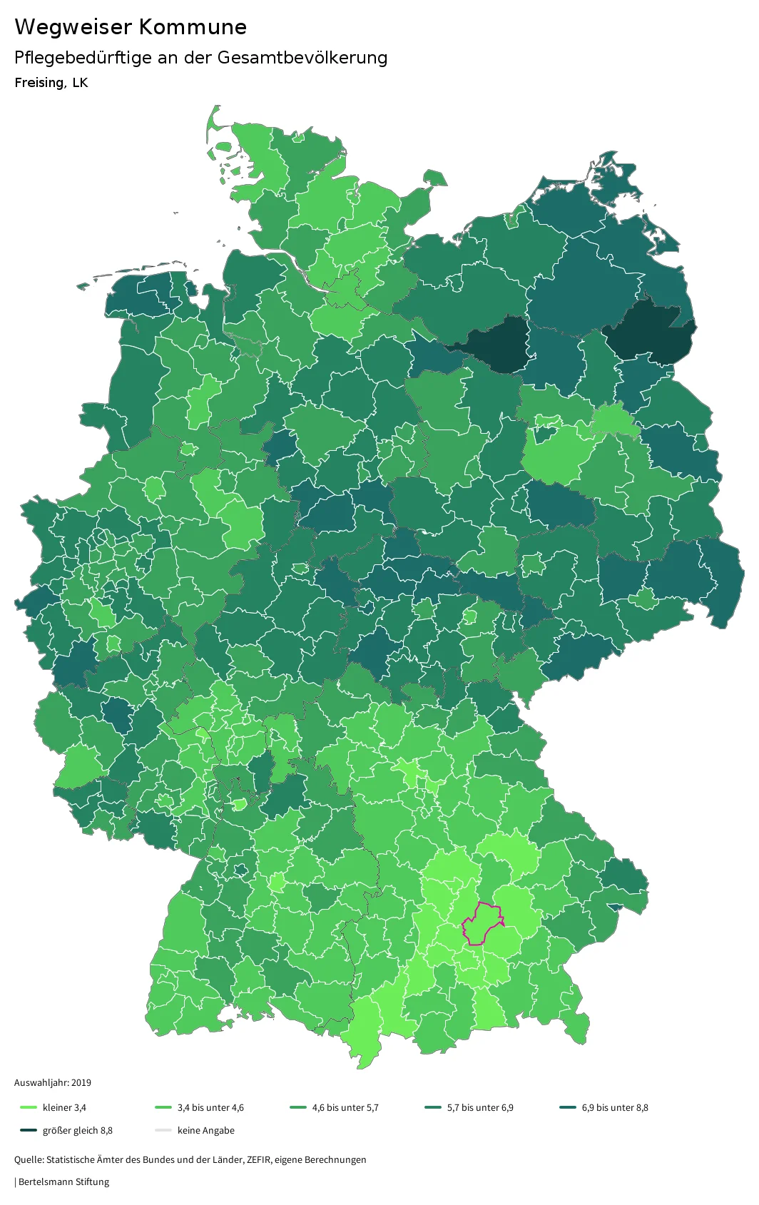Die 15 Kreise und kreisfreien Städte mit dem niedrigsten Anteil an Pflegebedürftigen an der Gesamtbevölkerung bundesweit im Jahr 2019 liegen alle in Bayern. Der Landkreis mit dem geringsten Anteil an Pflegebedürftigen ist der Landkreis Freising mit einem Anteil von 2,2 %.