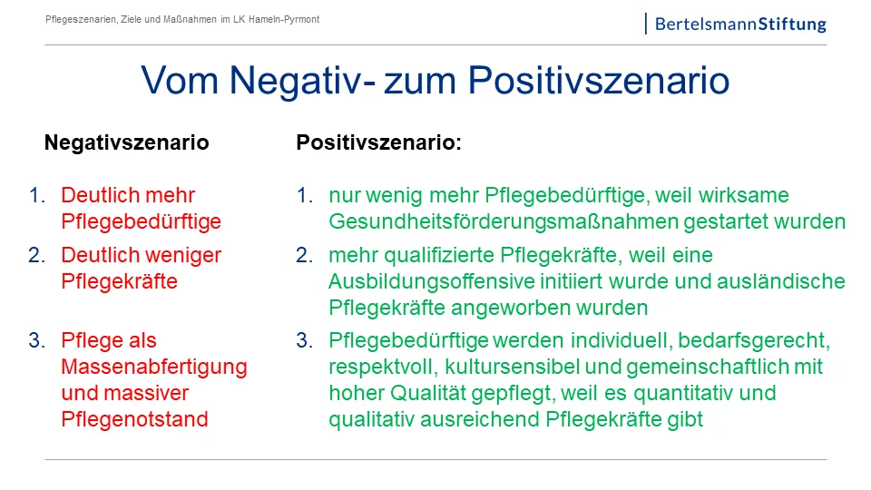 Ein solches datenbasiertes Negativszenario soll Menschen für ein Thema sensibilisieren und ein dazu passendes Positivszenario mit zielführenden Maßnahmen soll die beteiligten Akteure motivieren. Der „Pflegetisch“ dieses Landkreises hat in einem früheren Workshop folgende Ziele definiert und Maßnahmen gestartet, um einen möglichen Pflegenotstand zu verhindern: