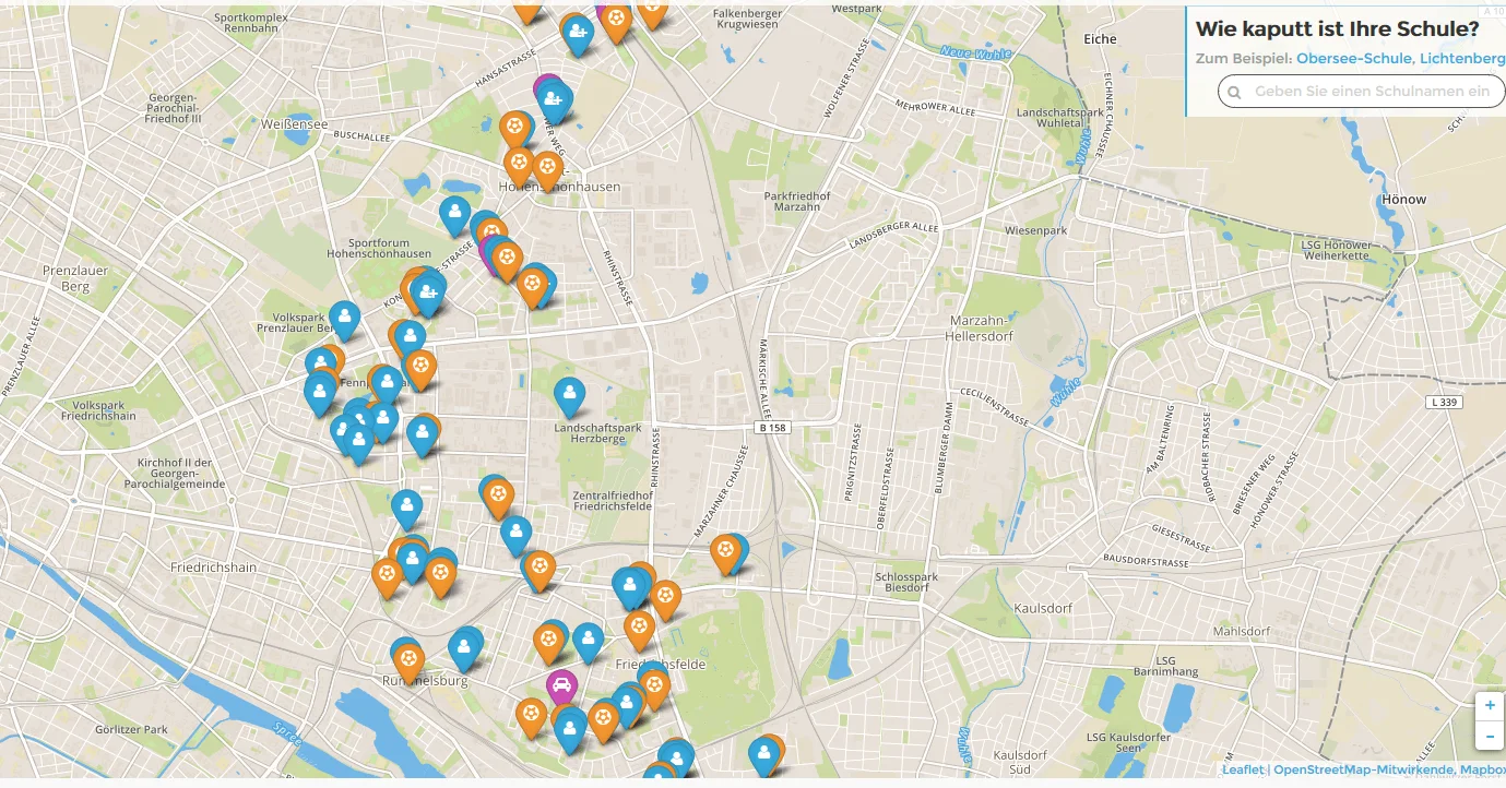 Screenshot einer Karte (Thomas Tursics) die den Renovierungsbedarf an Berliner Schulen visualisiert.